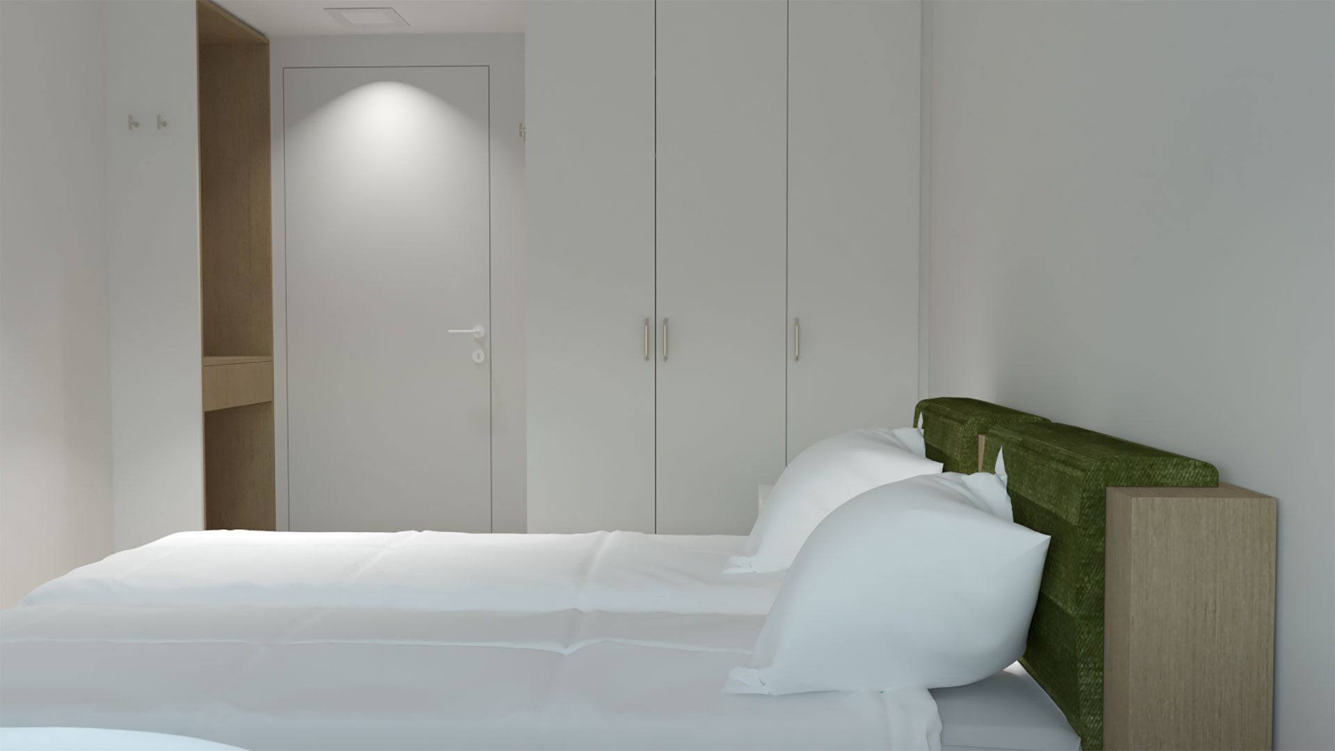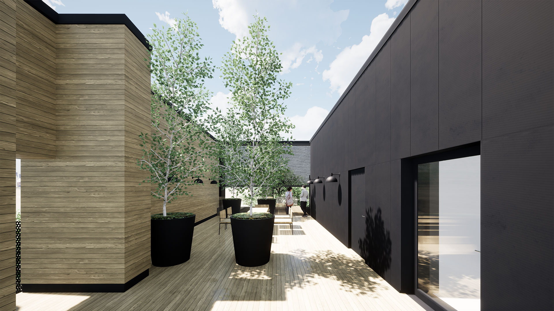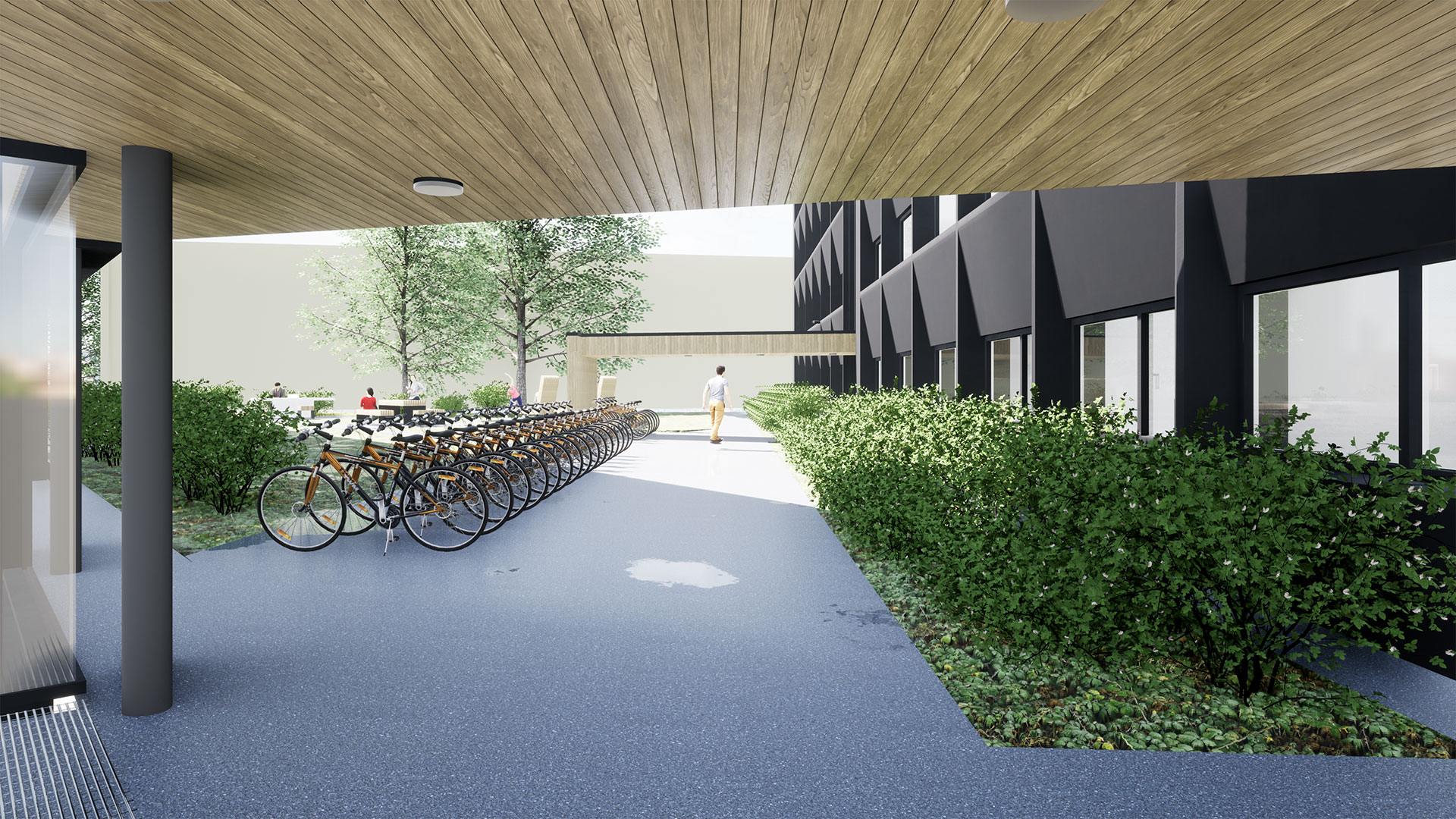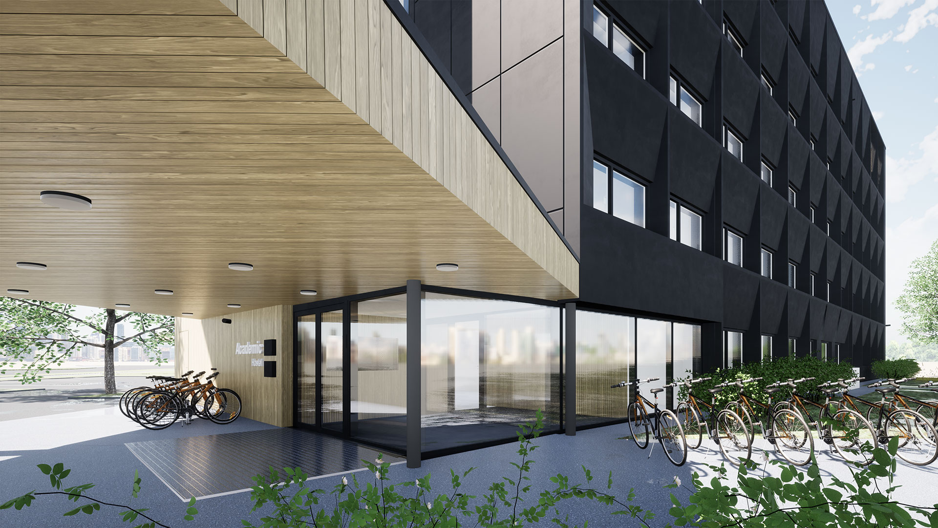 Currently, the fifth floor on both volumes is only partially built. In this design, the awkward recesses are concealed behind new facade cassettes, and roof terraces are planned for building users. The first-floor contour has been deliberately designed to feel welcoming and warm, with all entrance areas and canopies finished in wood.