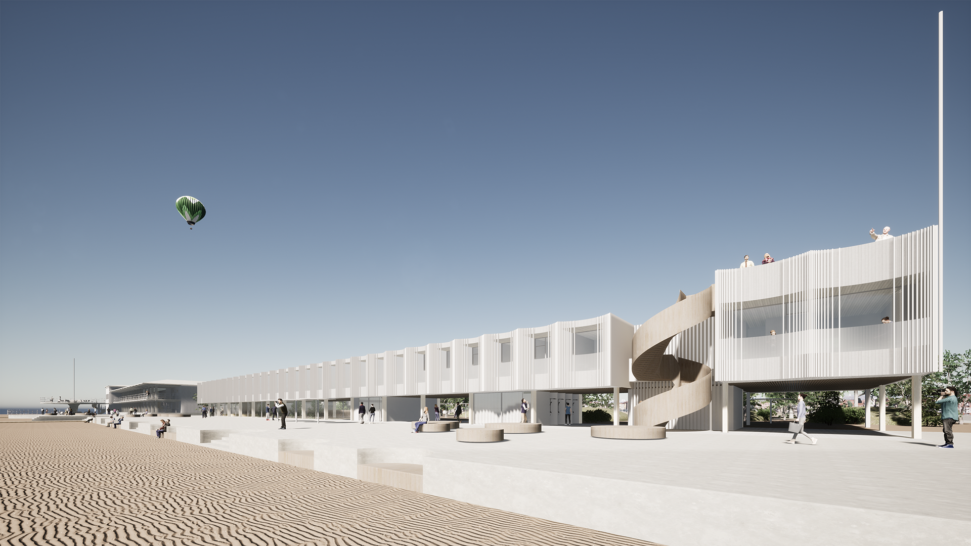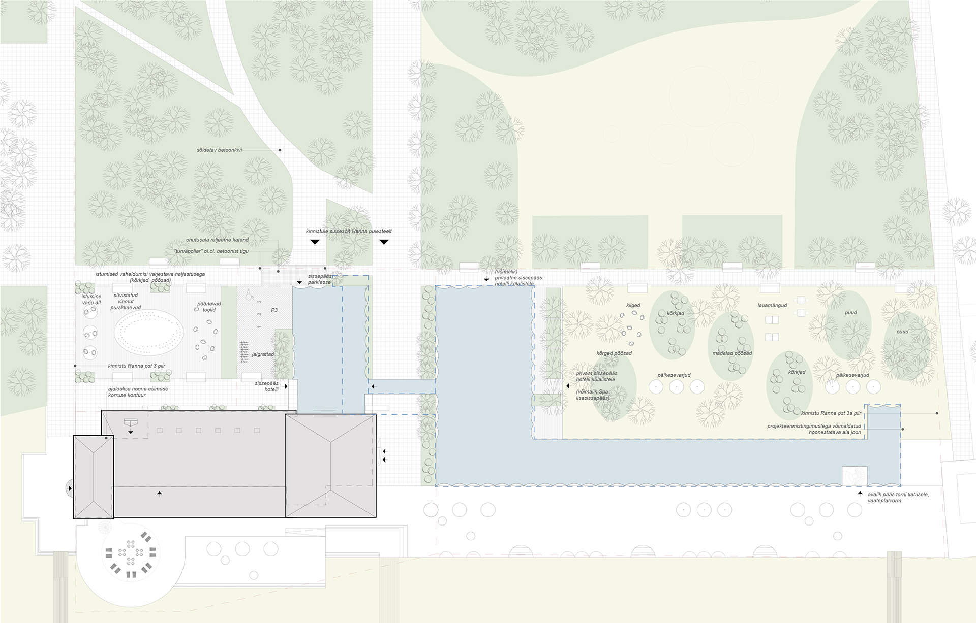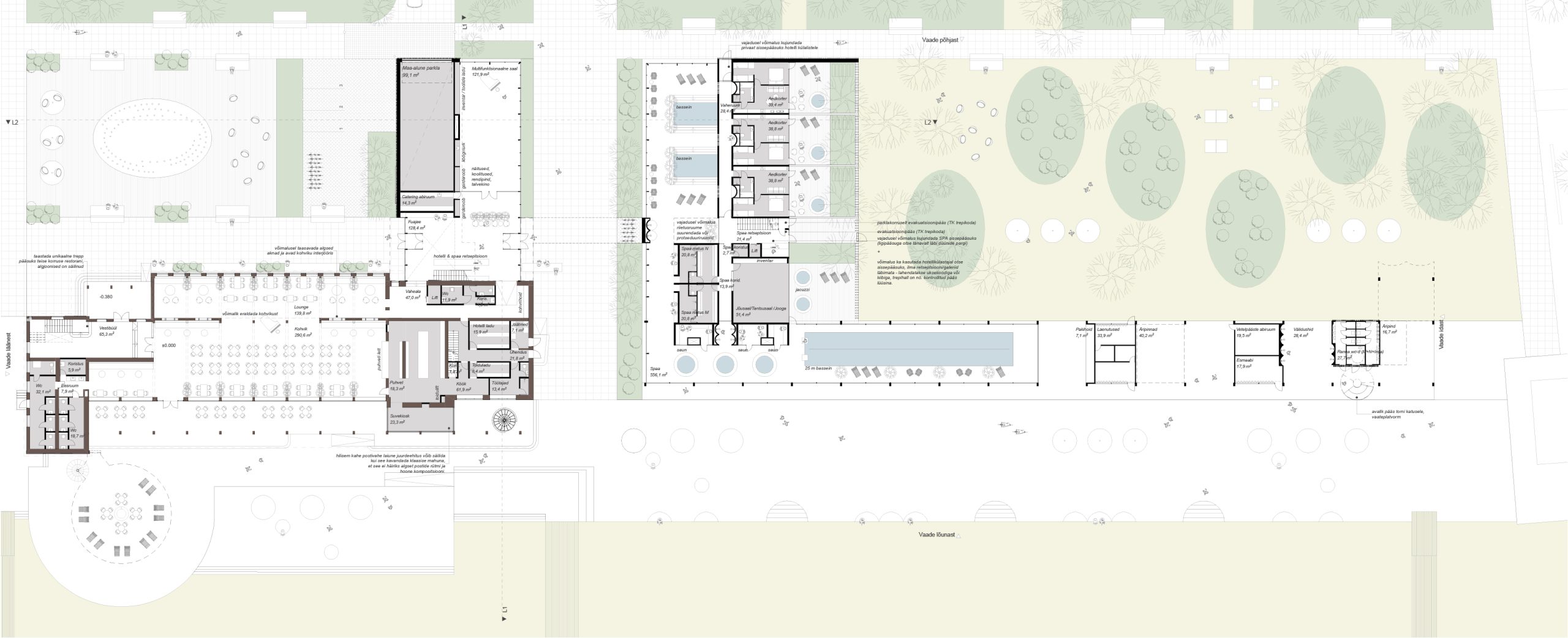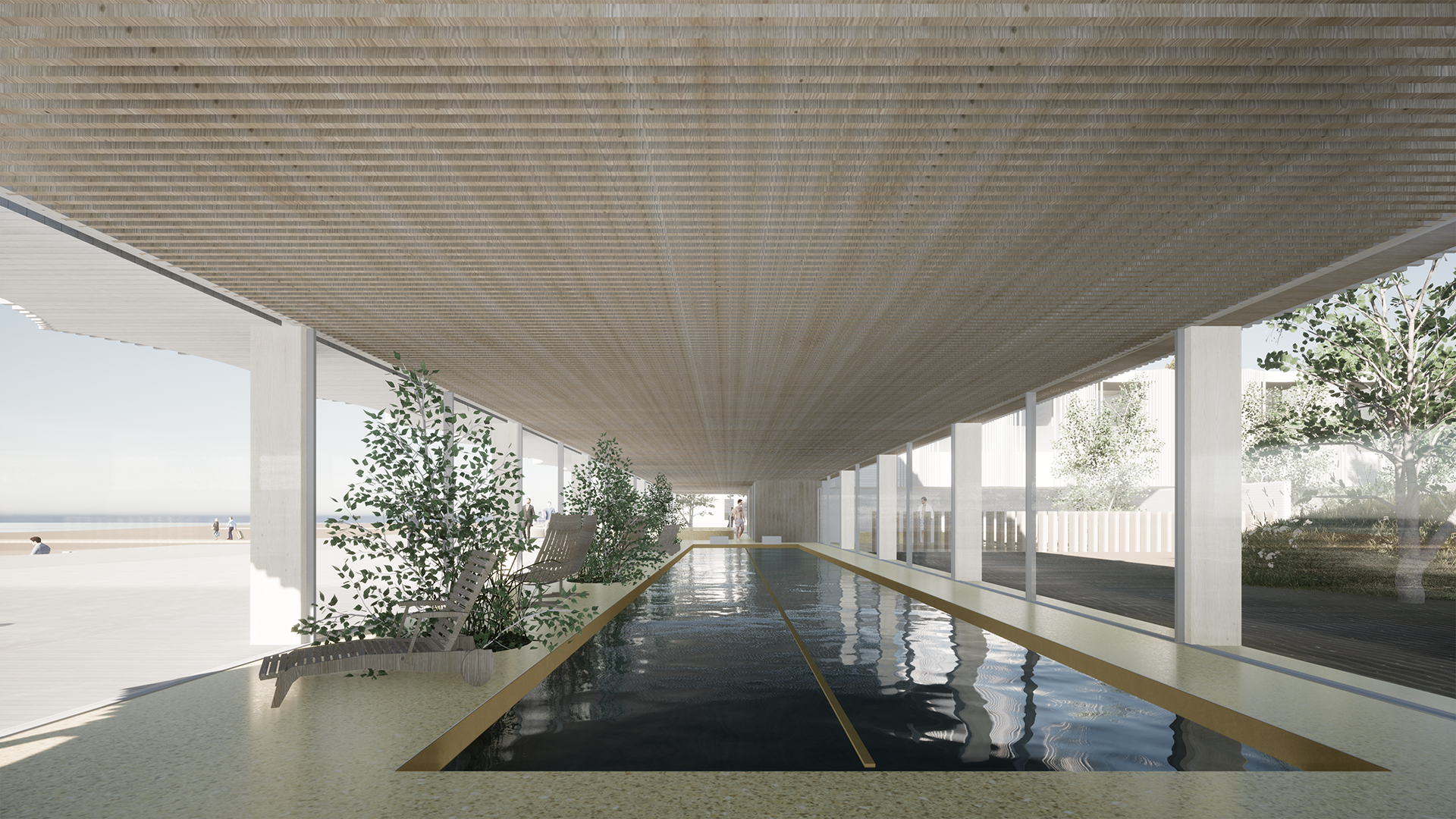 This competition entry proposes a solution that, on one hand, provides a dignified continuation to the lifecycle of a masterpiece by the ‘Old Master’ (as architect Kesa respectfully refers to his colleague), Olev Siinmaa – the Pärnu Beach Building. At the same time, the Pärnu beach area is enhanced by a prestigious new building that applies the same principles Siinmaa lived by, but in a contemporary key: functional and purposeful spatial design, avoidance of excessive decorativeness, and an honest approach to materials and structures, paired with high-quality craftsmanship, without ever neglecting the aesthetic side of the art of building.