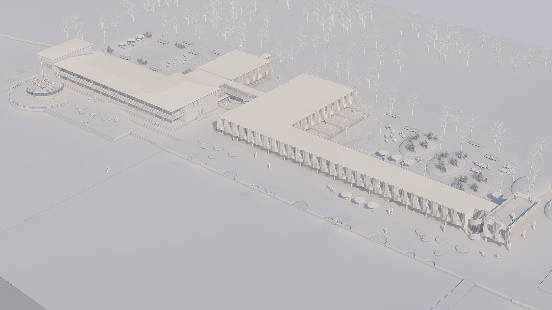 In the resulting complex, the symbiosis of old and new becomes meaningful — the new volume alongside the historic building is designed as a soft backdrop and complement. It creates a bright, fluid background, like a cloud that respects and highlights the historic landmark.